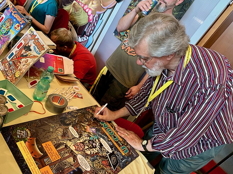 Denis kitchen signing u comix poster by steff murschetz with forensic biologist mark benecke comic festival muenchen munich comic con 2019 jpg