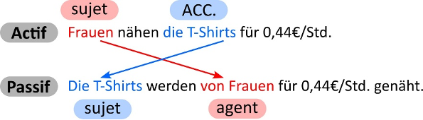Le passif est une voix qui modifie la perspective adoptée pour décrire l’action du verbe (ou le procès du verbe). À l’actif, la phrase met l'accent sur le sujet grammatical, qui correspond à « l'agent », c'est-à-dire l'entité qui réalise une action. La phase active répond à la question « qui fait quoi ? ». Au passif, le sujet grammatical n'est pas l'agent mais le « patient », c'est-à-dire l'entité qui subit l’action. L'objet de la phrase active devient le sujet de la phrase passive, et l'agent est soit relégué à un G PREP, soit il disparaît. Le passif renverse donc la perspective et porte l'accent sémantique sur l'action subie ((La focalisation peut également porter sur le complément d'agent lui-même, lorsque celui-ci est en première position et qu'il répond à la question « von wem werden die T-Shirts genäht? », car il porte alors l'accent d'énoncé: von °Frauen werden die T-Shirts genäht.)) par le patient.