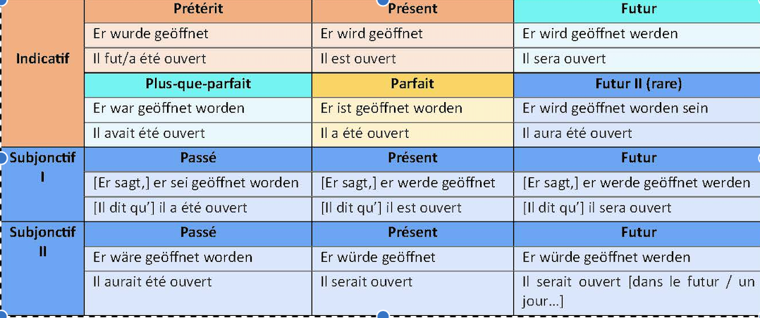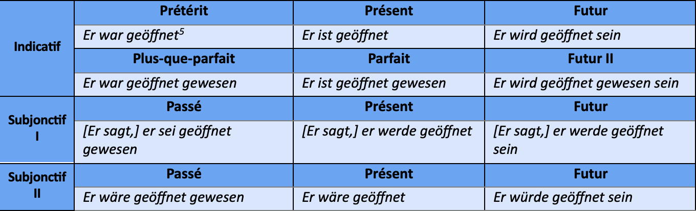 Note ((Puisqu'en français la distinction aspectuelle, lorsqu'elle doit être exprimée, est essentiellement rendue par des périphrases, nous ne reportons pas dans ce tableau l'ensemble des traductions du passif état, celles-ci ne se distinguant pas formellement du passif processuel. Seule la traduction du prétérit du passif état peut faire apparaître une différence, notamment par le recours à l'imparfait : Er war geöffnet ⇒ il était ouvert.))