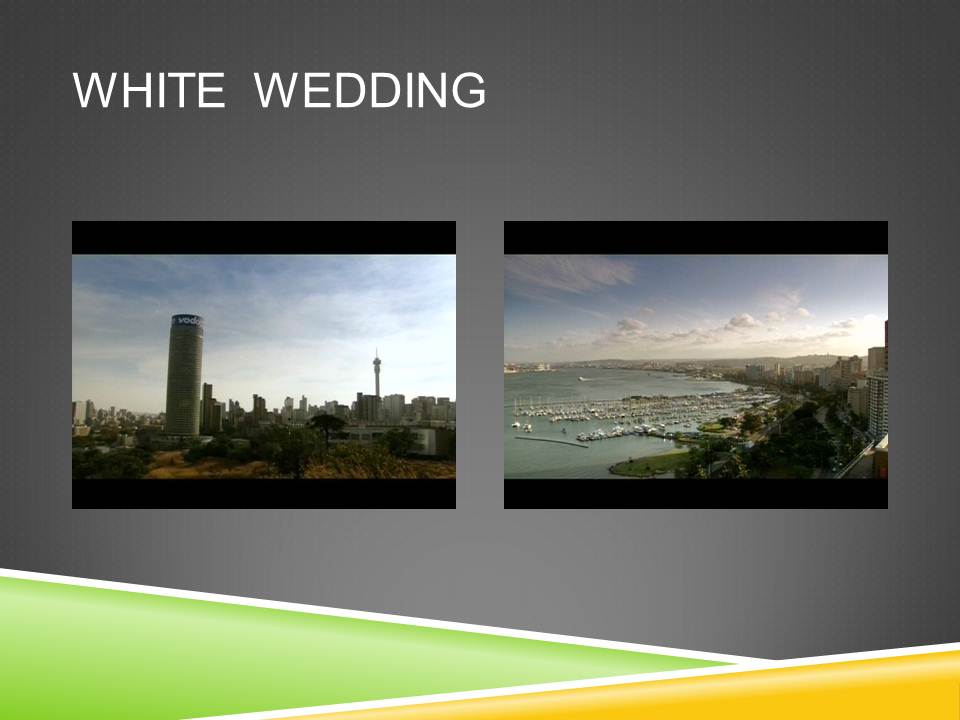 La séquence que je vais vous présenter est extraite de White Wedding et est à ma connaissance l’une des seules représentations visuelles du territoire sud-africain dans son ensemble qui figure dans le cinéma sud-africain des années 2000. Il s’agit de la séquence introductive du film, moitié road-movie, moitié comédie romantique. Selon moi, c’est cette séquence qui donne l’exemple le plus clair d’une géographie vécue de l’Afrique du Sud.