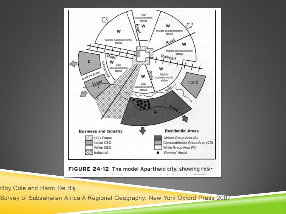 - la séparation des zones résidentielles pour Noirs, pour Blancs, pour Métisses ou Indiens.