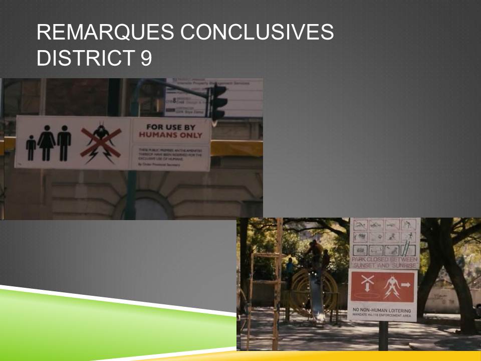 Le film est profondément sud-africain en ce qu’il choisit cet ancrage dans le réel pour opérer le décrochage fantastique. District 9 se déroule pourtant dans une Afrique du Sud réconciliée, post-apartheid, ou Noirs et Blancs cohabitent… mais Blomkamp, en choisissant de fonder la dystopie sur l’apartheid, semble ici conscient du fait que l’ancien régime structure encore profondément l’espace sud-africain, qu’il soit réel ou, comme ici, imaginaire.