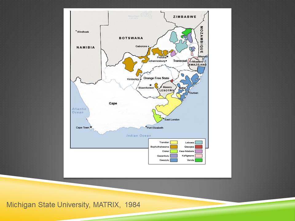 J’ai choisi cette image parce qu’elle montre bien la faible proportion du territoire consacrée aux bantoustans (états-provinces semi-indépendants où les populations noires disposaient d’une pseudo-souveraineté politique), d’une part, et le morcellement du territoire (exemple: le Ciskei et le Transkei partageaient de nombreux traits culturels et linguistiques). Dans leur ensemble, environ 13% du territoire étaient accordés à 75% de la population. Quels étaient les objectifs de cette politique ?