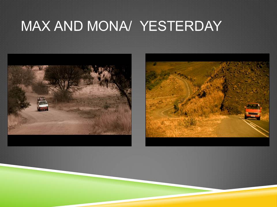 La ville, clairement identifiée comme Johannesburg dans les deux cas, s’oppose aussi à la campagne car celle-ci est indéterminée. Si la ville est spécifique, la campagne est générique. Les deux films susmentionnés, Max and Mona et Yesterday, s’ouvrent sur des séquences où un personnage est tout à fait isolé dans un paysage vide, dépourvu de présence humaine mais aussi de tout marqueur de cette présence.