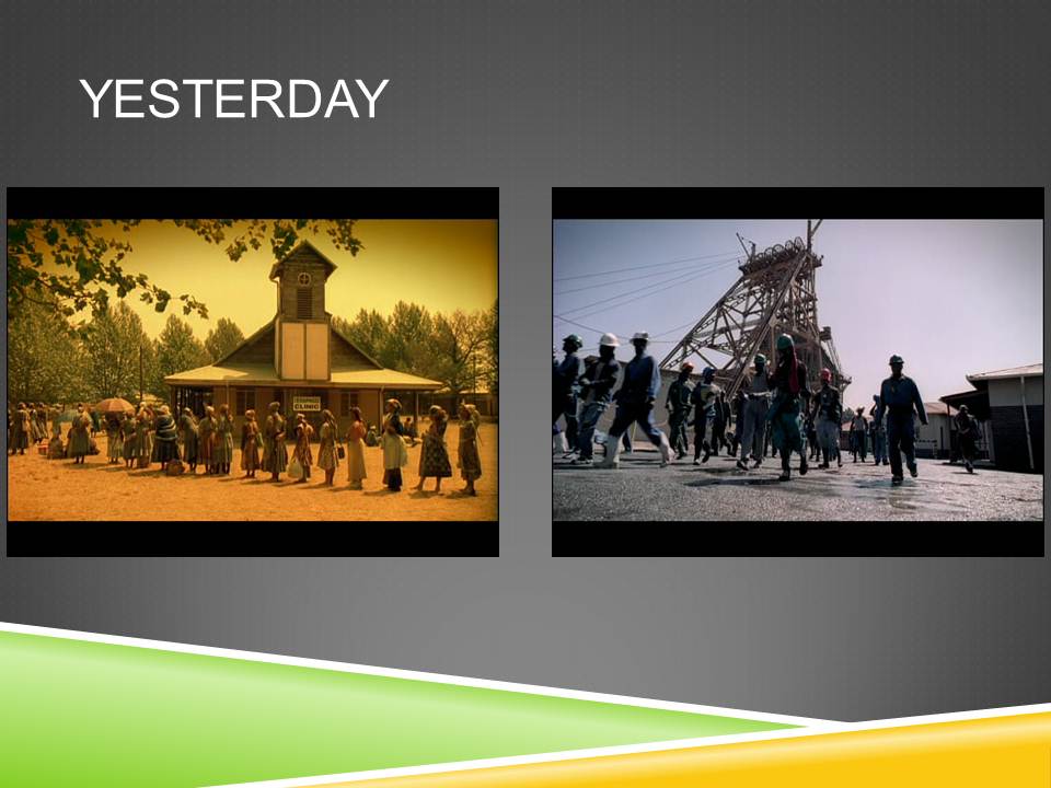 Le cinéma sud-africain oppose la campagne en termes de tradition vs. modernité mais également, pour Yesterday, entre campagne peuplée de femmes et environnement urbain de la mine peuplé d’hommes.