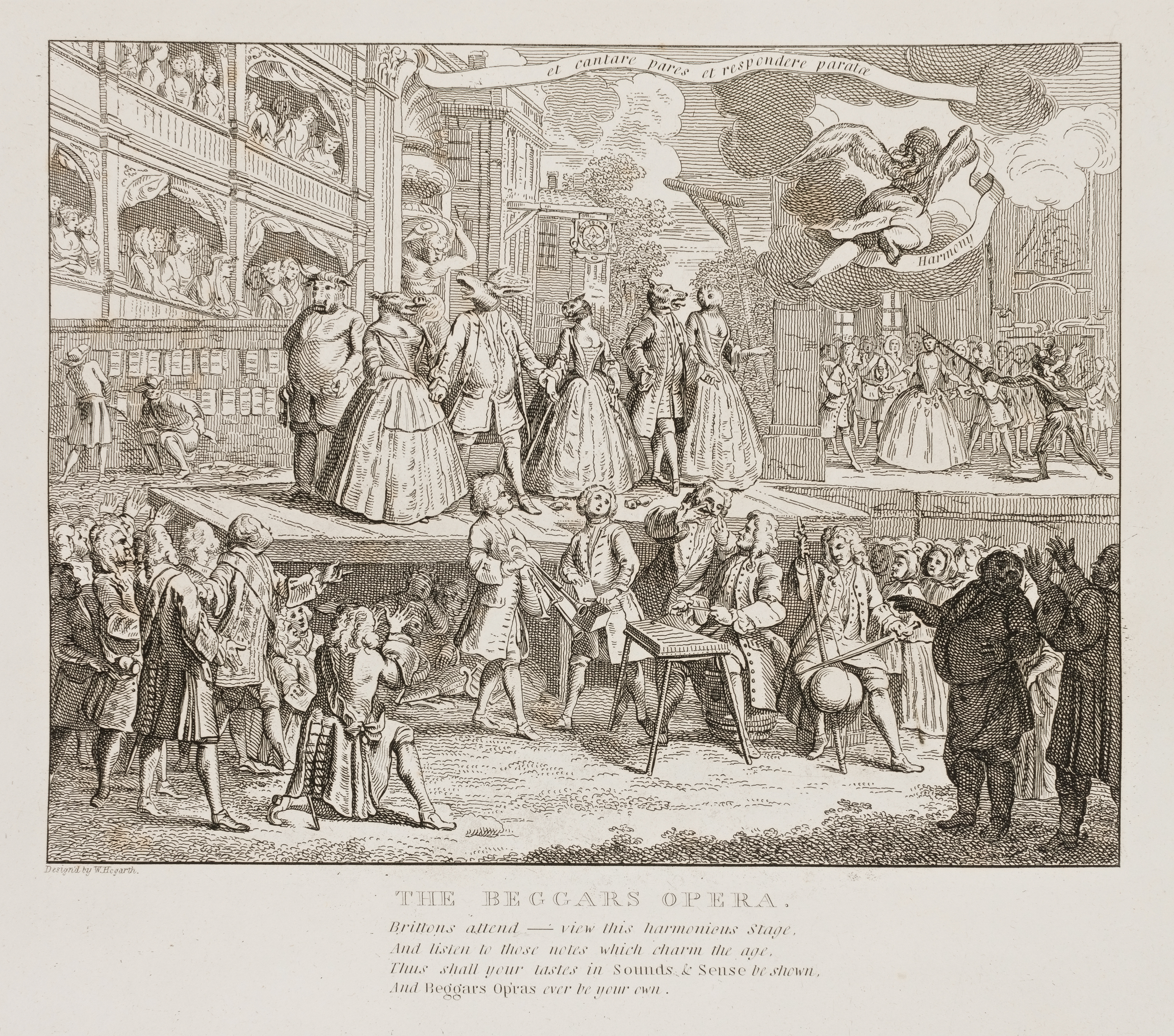 Harmony, flying in the air, turns her back on the English Playhouse, and hastens towards the Rival Theatre. Musicians stand in front of the former, playing on the Jew's harp, the salt-box, the bladder and string, bagpipes, &c. On one side are people of distinction, some of whom kneel, as if making an offer to Polly, or paying their adorations to her. To these are opposed a butcher, &c. expressing similar applause.