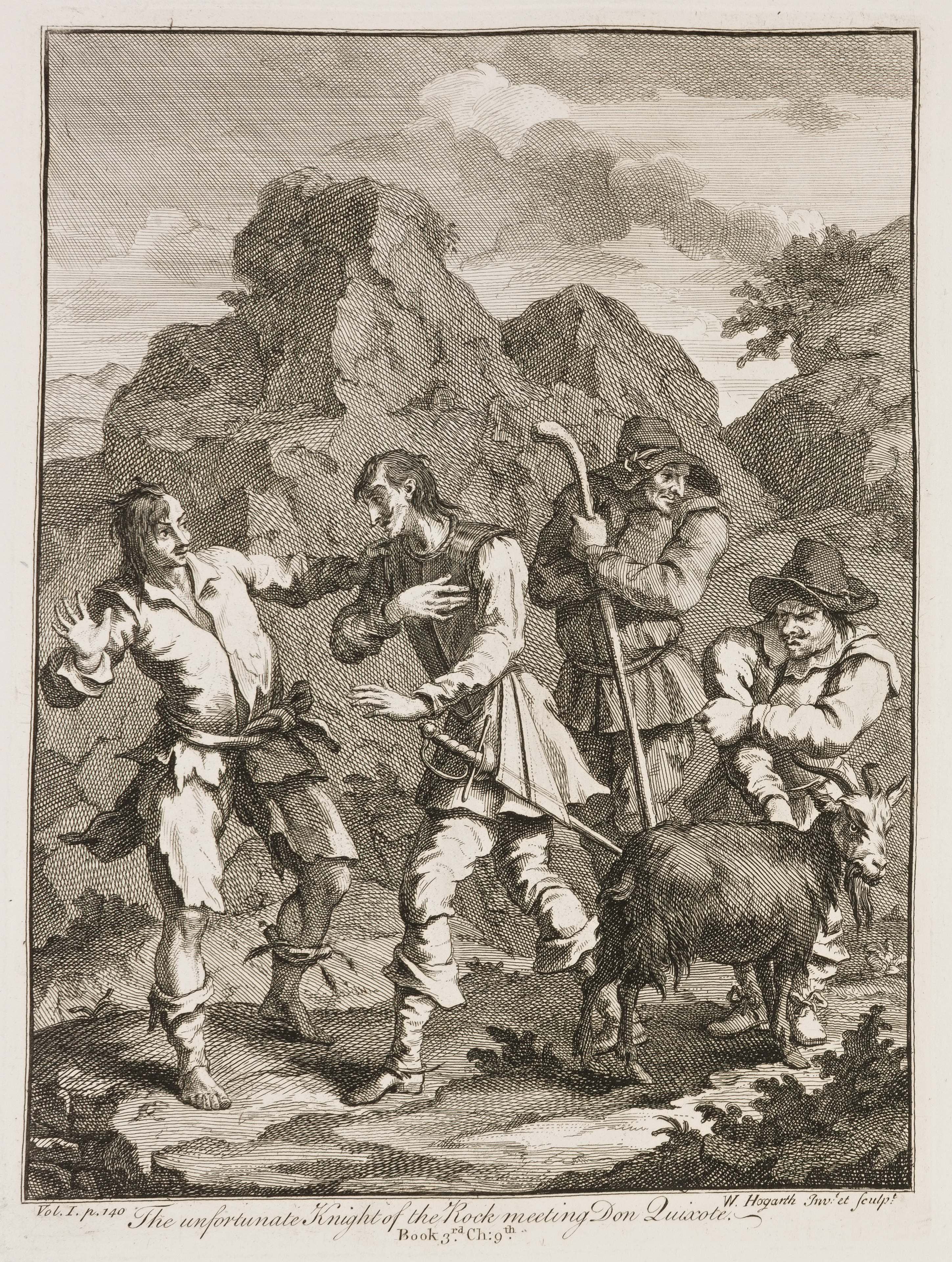 When Lord Carteret was seeking Artists to design the Plates for his Spanish Edition of this famous Romance, which was published in 1738, Hogarth of coarse was not overlooked; and these Six Prints were in consequence designed and etched by himself in a bold and masterly style. His performances, however, gave so little satisfaction to the Noble Employer, that, after having been paid for, they were laid aside.