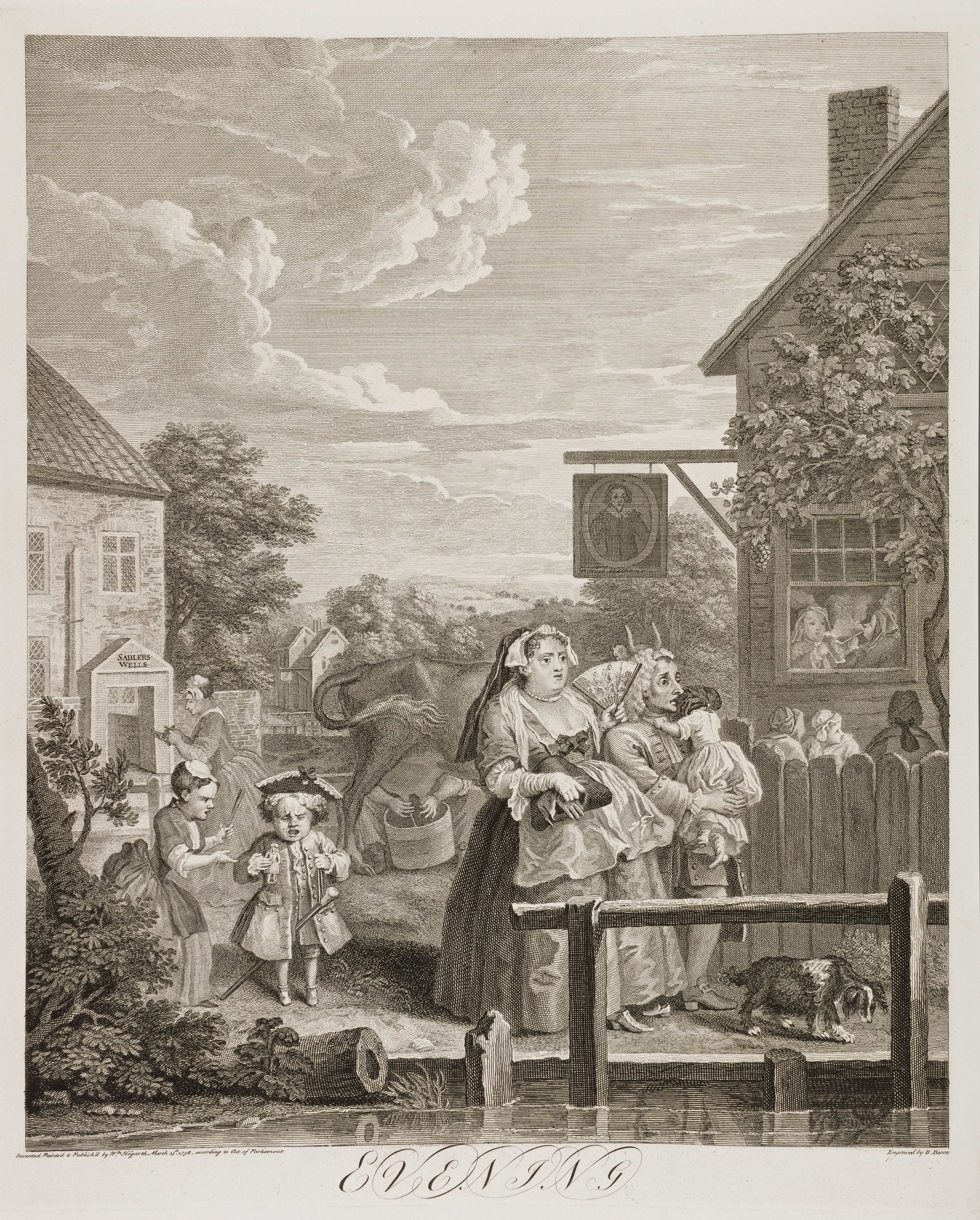 It is not easy to imagine fatigue better delineated than in the appearance of this amiable pair. In a few of the earliest impressions, Mr. Hogarth printed the hands of the man in blue, to shew that he was a Dyer, and the face and neck of the Woman in red, to intimate her extreme heat. The Hopes of the Family, with a cockade in his hat, and riding upon papa's cane, seems much dissatisfied with female sway. Nothing can be better imagined than the group in the alehouse. They have been taking a refreshing walk into the country, and, being determined to have a cooling pipe, seat themselves in a chair-lumbered closet, with a low ceiling; where every man putting off his wig, and throwing a pocket-handkerchief over his head, inhales the fumes of hot punch, the smoke of half a dozen pipes, and the dust from the road. The old Gentleman in a black bag-wig, and the two Women near him, sensibly enough, take their seats in the open air. From a Woman milking a cow, we conjecture the hour to be about five in the afternoon: and, from the same circumstance, I am inclined to think this agreeable party are going to their pastoral bower, rather than returning from it. The cow and dog appear as much inconvenienced by heat as any of the party: the former is whisking off the flies; and the latter creeps unwillingly along, and casts a longing look at the crystal river, in which he sees his own shadow. A remarkably hot Summer is intimated by the luxuriant state of a vine creeping over an alehouse window.