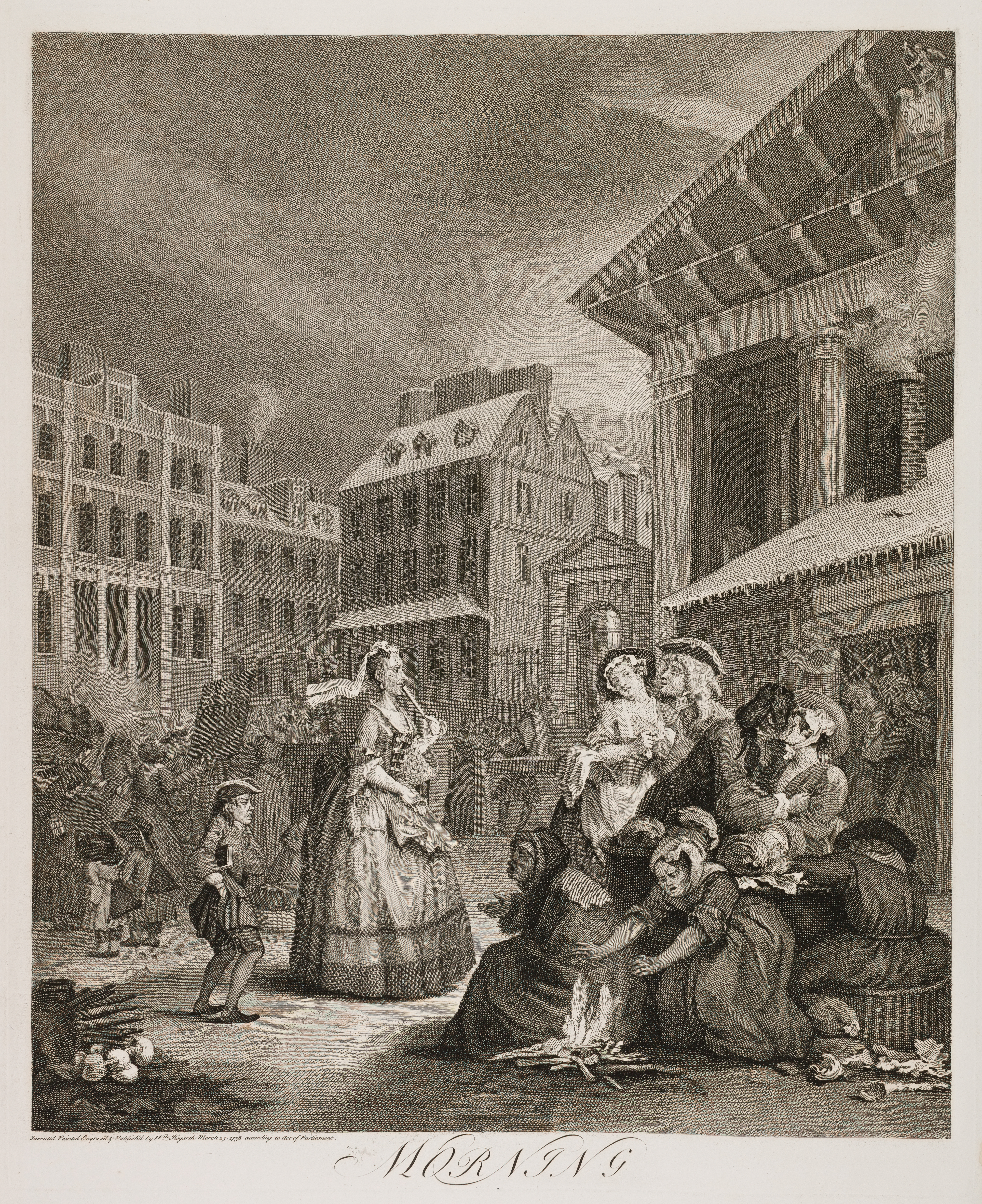Be this as it may, this Lady, with a shivering Foot-boy carrying her Prayer-book, is about to attend the Morning-service; and looks with a scowling eye at the poor Girls who are suffering the embraces of two drunken Beaux that are just staggering out of Tom King's Coffee-house. One of them, from the basket on her arm, I conjecture to be an Orange-girl; she shews no displeasure at the boisterous salute of her Hibernian Lover.
