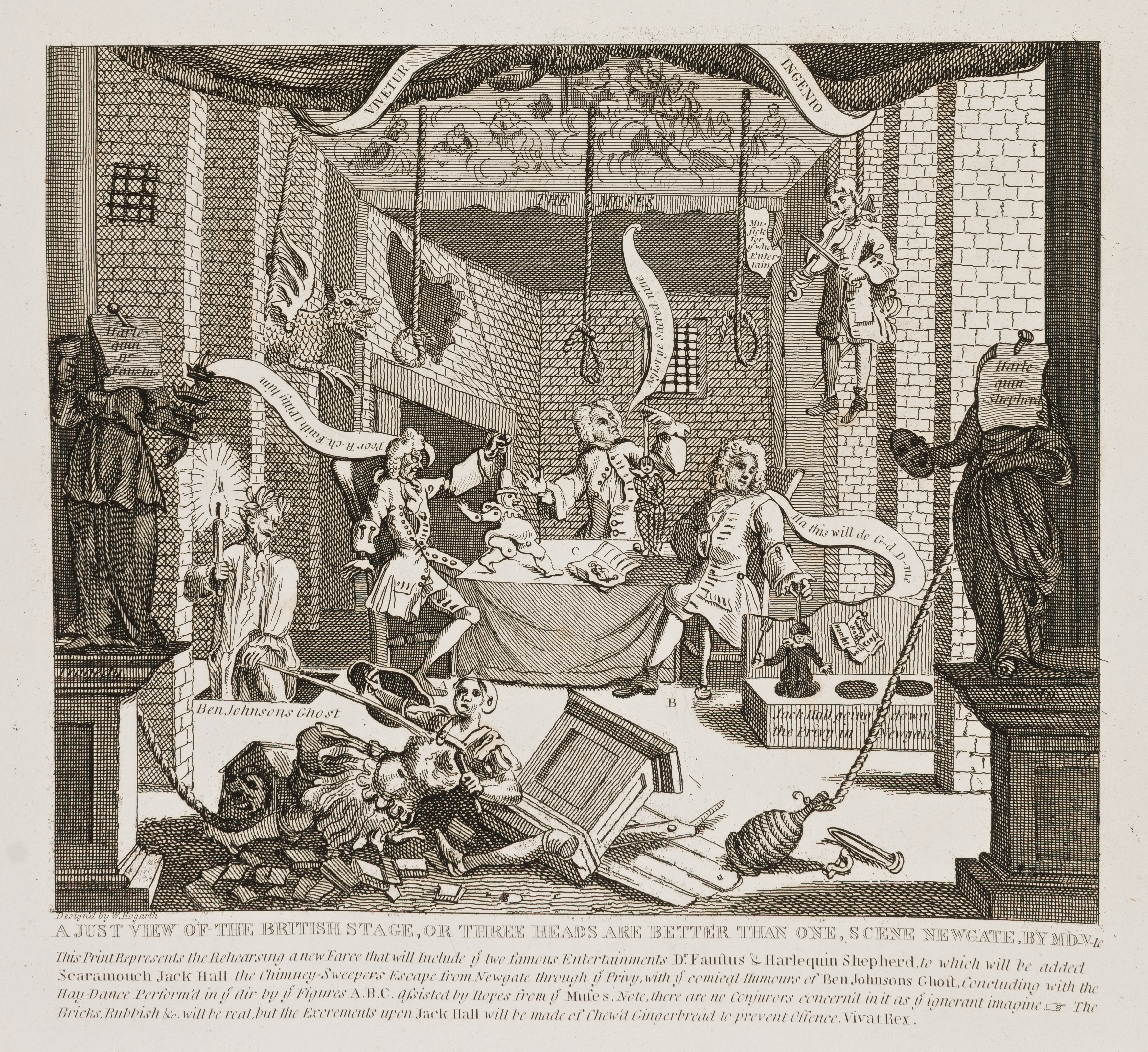 Though the inscription engraved under it is sufficiently explanatory, it may be added, that Mr. Devoto was Scene-painter either to Drury-lane or Lincoln's-inn-fields, and also to Goodman's-fields Theatre; that the ropes mentioned in the inscription are no other than halters, suspended over the heads of the three Managers; and that the labels issuing from their respective mouths convey the following characteristic words. The airy Wilkes, who dangles the effigies of Punch, exclaims, "Poor R—ch! faith, I pitty him." The Laureat Cibber, who is amusing himself in playing with Harlequin, invokes the Muse painted on the ceiling— "Assist, ye sacred Nine!" And the solemn Booth, letting down the figure of Jack Hall into the forica, is most tragically exclaiming, with an oath—"Ha! this will do." At the same instant Ben Jonson's ghost is rising through the Stage, and insulting a pantomime statue fallen from its base.