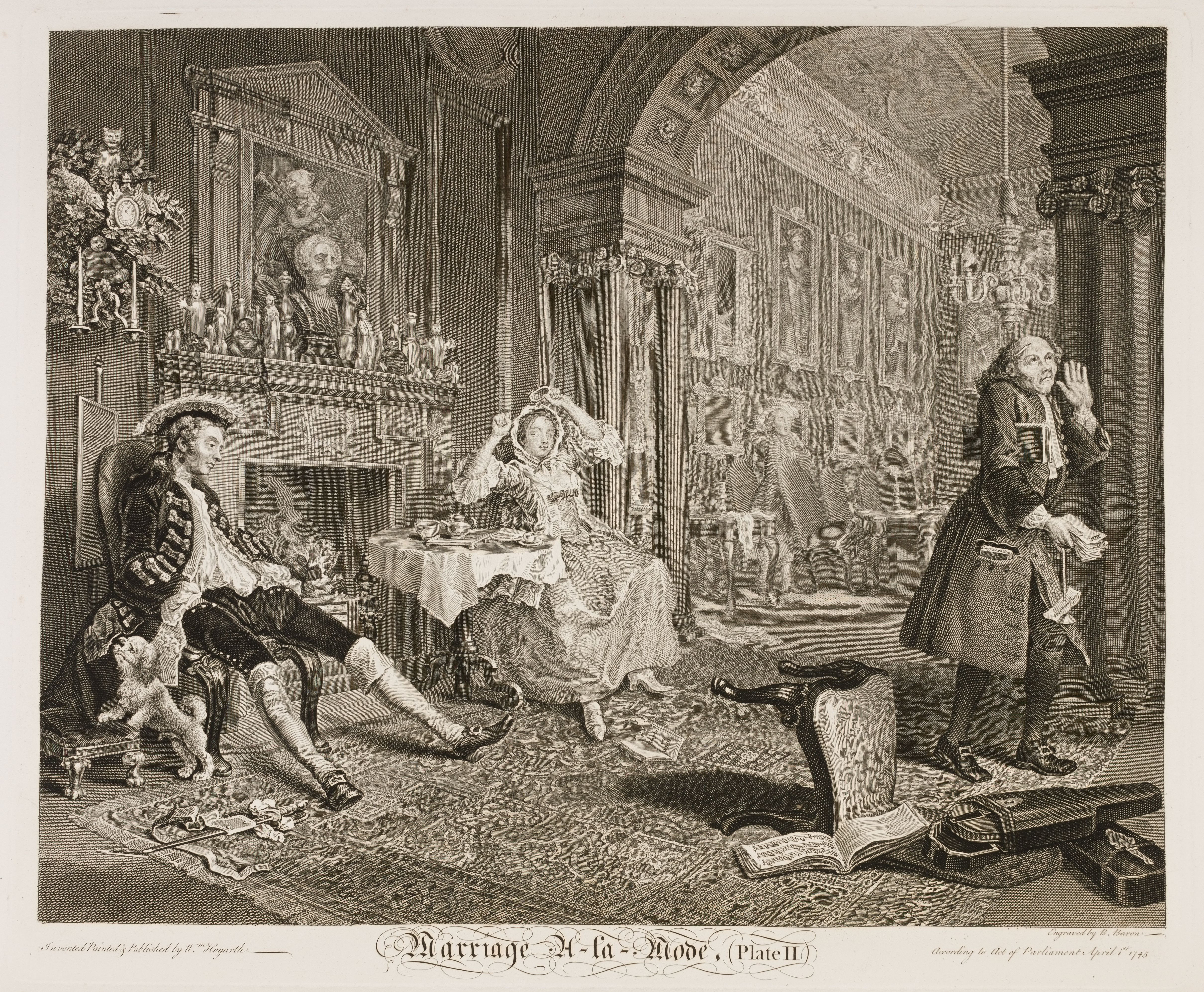 Fatigued with the dissipations of the night, and having had his sword broken in a riot, his Lordship comes home at noon, where he beholds his Lady just arisen, and seated en dishabille at her first repast. His melancholy countenance and position proclaim that he has been unsuccessful at the gaming-table. The cap and ribband, hanging out of his pocket strongly indicate, that part of the night has been passed in the company of some favourite female; and we are induced to suppose the dog had originally belonged to the Lady who is the proprietor of the cap, from its exciting his attention so particularly. Her Ladyship's Portrait is said to have been taken from Francis Hayman, the Historical Painter, who was frequently Hogarth's model.
