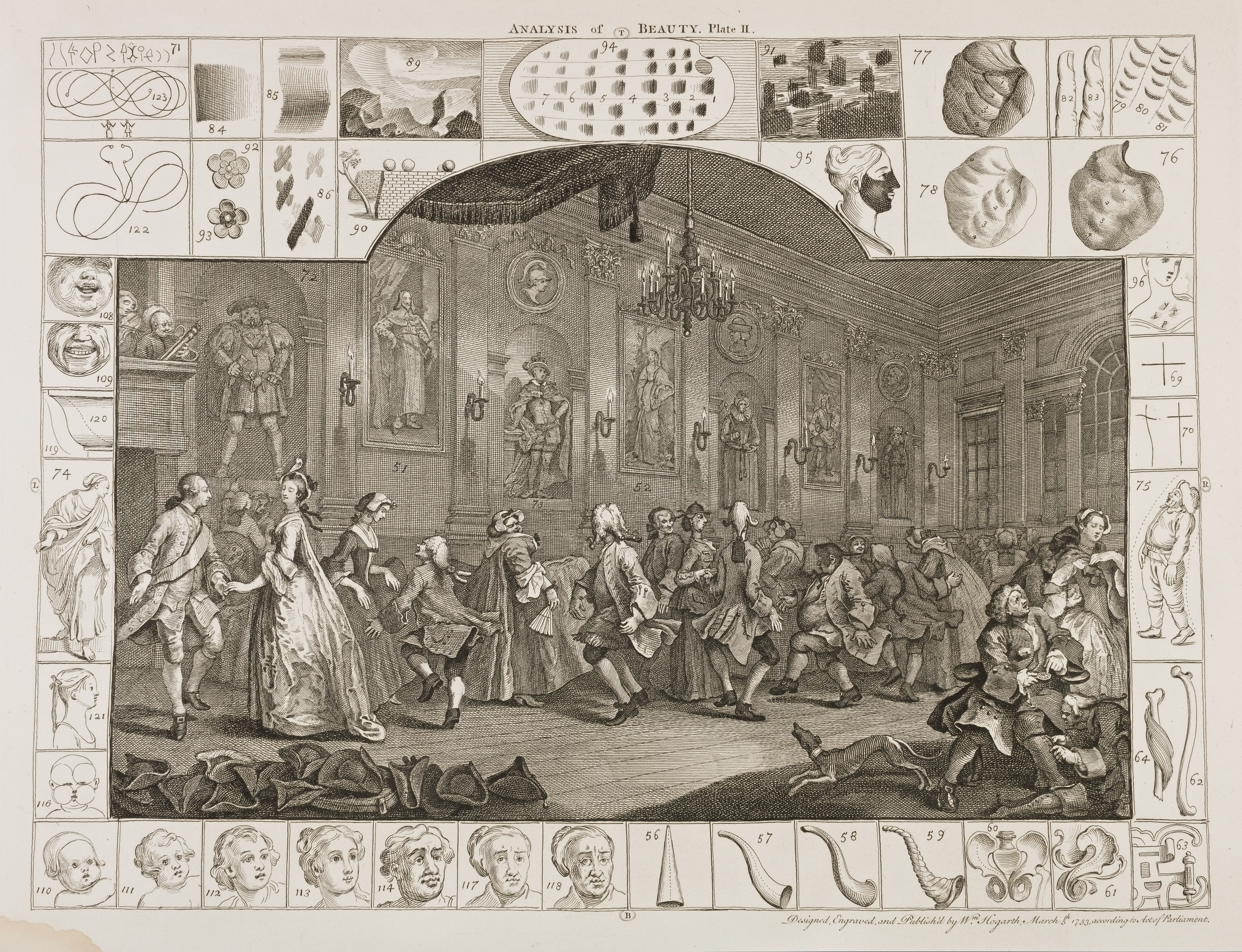 The Second Plate is found in three different states. In the original Plate the principal figure represented the late King, then Prince of Wales; but Hogarth was requested to alter it. The present Figure is said to have been taken for the late Duke of Kingston; yet, though like him, is stiff, and far from graceful. The changes repeatedly made as to the two principal figures are numerous. It may, however, be sufficient to point out some single circumstance in each, that may serve as a mark of distinction. In the first, the principal Female has scarcely any string to her necklace; in the second it is lengthened; and still more considerably increased in the third. In the first and second editions also of this Plate, between the young Lord and his Partner, and just under the figure of the man who is pointing out to a Lady the stateliness of King Henry the Eighth, is a vacant easy chair. In the third Impression, this chair is occupied by a person asleep. Mr. Steevens says, "that this Country-dance was originally meant to have formed one of the scenes in The Happy Marriage. The old Gentleman hastening away his Daughter, while the Servant is putting on his spatterdashes seems to countenance the supposition; and, having since examined the original sketch in oil, I observe that the Dancing-room is terminated by a large old-fashioned bow-window, a circumstance perfectly consistent with the scenery of the wedding described in the Analysis by Hogarth. The Couple designed for specimens of Grace appear, not where they stand in the Print, but at the upper end of the room; and so little versed was our Painter in the etiquette of a wedding-ball, that he has represented the Bride dancing with the Bridegroom. As different fashions, however, prevail at different times, this observation may be wrong. Mr. Walpole observes, that Hogarth's samples of grace, a young Lord and Lady, are strikingly stiff and affected: they are a Bath Beau and a Country Beauty. Dr. Beattie, speaking of the modes of combination, by which incongruous qualities may be presented to the eye, or the fancy, so as to provoke laughter, observes, "A Country-dance of men and women, like those exhibited by Hogarth in his Analysis of Beauty, could hardly fail to make a beholder merry, whether he believed their union to be the effect of design or accident. Most of those persons have incongruities of their own, in their shape, dress, or attitude; and all of them are incongruities in respect of one another: thus far the assemblage displays contrariety, or want of relation. And they are all united in the same dance; and thus far they are mutually related. And, if we suppose the two elegant figures removed, which might be done without lessening the ridicule, we should not easily discern any contrast of dignity and meanness in the group that remains."