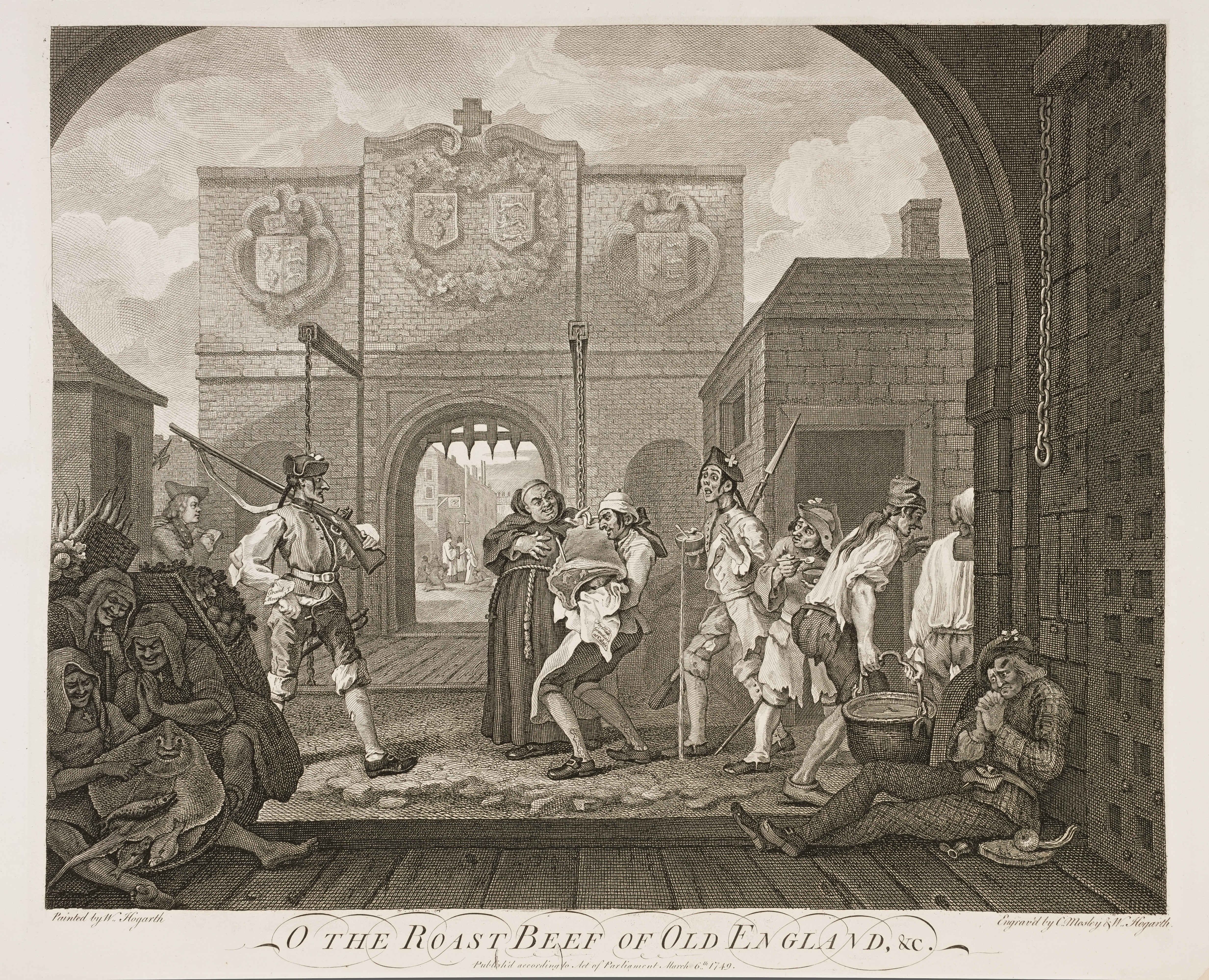 "After the March to Finchley," says Hogarth, "the next Print that I engraved was 'The Roast Beef of Old England,' which took its rise from a visit I paid to France the preceding year. The first time an Englishman goes from Dover to Calais, he must be struck with the different face of things at so little a distance. A farcical pomp of War, pompous parade of Religion, and much bustle with very little business. To sum up all, poverty, slavery, and innate insolence, covered with an affectation of politeness, give you even here a true picture of the manners of the whole Nation. Nor are the Priests less opposite to those of Dover than the two shores. The Friars are dirty, sleek, and solemn; the Soldiery are lean, ragged, and tawdry; and as to the Fish-women, they are absolute leather. As I was sauntering about, and observing them, near the Gate, which it seems was built by the English when the place was in our possession, I remarked some appearances of the Arms of England on the front. By this and idle curiosity I was prompted to make a sketch of it; which being observed, I was taken into custody: but, not attempting to cancel any of my sketches or memorandums, which were found to be merely those of a Painter for his private use, without any relation to Fortification, it was not thought necessary to send me back to Paris. I was only closely confined to my own lodgings till the wind changed for England; where I no sooner arrived, than I sat about the Picture; made the Gate my back-ground, and in one corner introduced my own Portrait, which has generally been thought a correct likeness, with the Soldiers hand upon my shoulder. By the fat Friar, who stops the lean Cook that is sinking under the weight of a vast sirloin of beef, and two of the Military bearing off a great kettle of soup maigre, I meant to display to my own Countrymen the striking difference between the Food, Priests, Soldiers, &c. of two Nations, so contiguous that in a clear day one coast may be seen from the other. The melancholy and miserable Highlander, browzing on his scanty fare, consisting of a bit of bread and an onion, is intended for one of the many that fled from their countryafter the Rebellion in 1745."