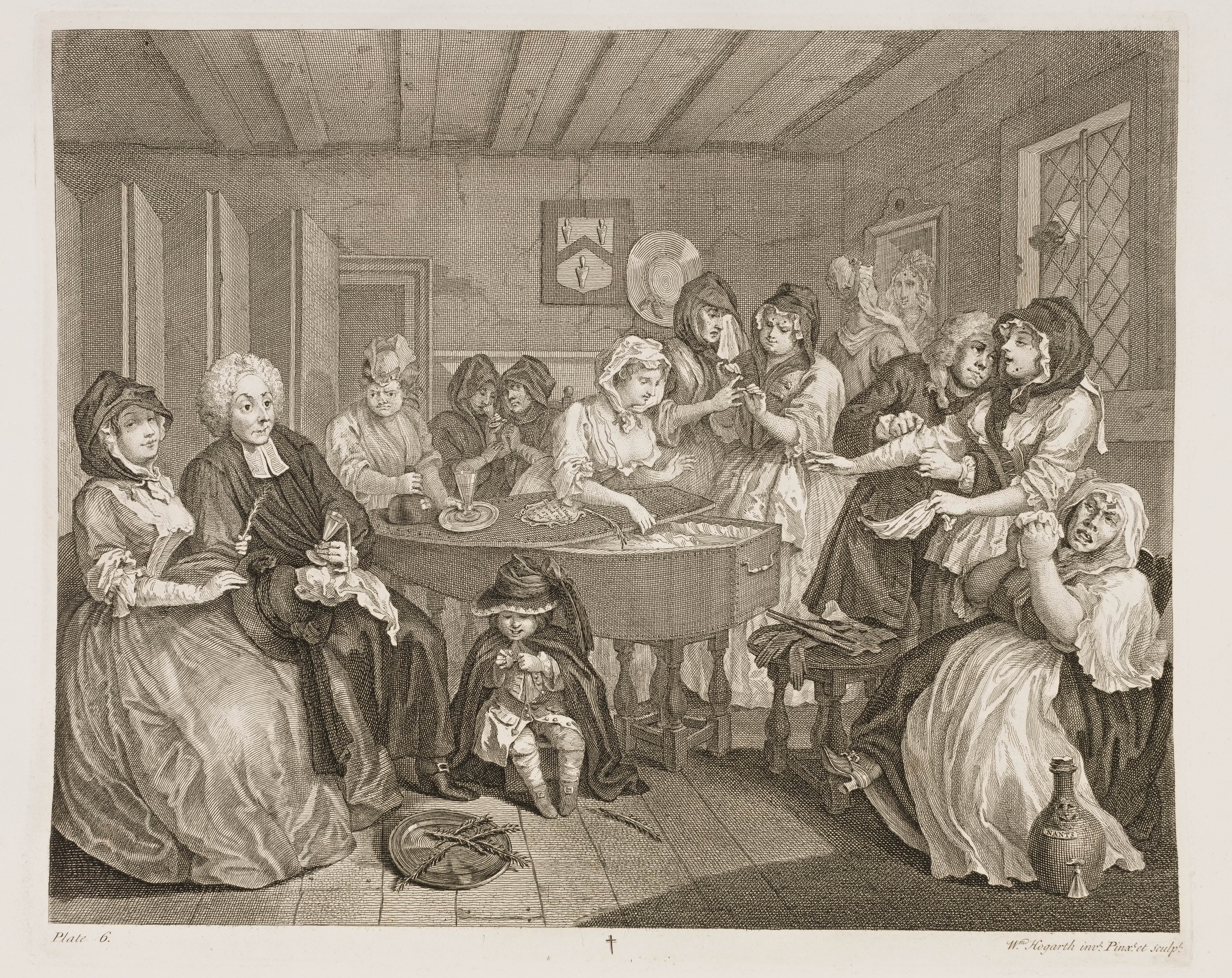 Rouquet finishes his illustration of the fifth plate by observing, that the story might have been concluded here. "The Author seems here to have completed his design. He has accompanied his Heroine to her last breath. He has conducted her from infamy to poverty, through the seducing paths of libertinism. His desire to recall, or to correct, those whose weakness or ignorance exposes them to similar misfortunes, is well pursued. With this Plate the Tragedy may be said to close; and what follows is a mere After-piece. It is the Farce of which the deceased is rather the occasion than the subject."—Such is the criticism of Rouquet, but I cannot absolutely concur in the justness of it. Hogarth found an opportunity to convey admonition, and enforce his moral, even in his last Plate. It is true that the exploits of our Heroine are concluded, and that she is no longer an agent in her own story. Yet, as a wish prevails, even among those who are most humbled by their own indiscretions, that some respect should be paid to their remains; that they should be conducted by decent friends to the grave, and interred by a Priest who feels for the dead that hope expressed in our Liturgy; let us ask, whether the memory of our Harlot meets with any such marks of social attention, or pious benevolence. Are not the preparations for her funeral licentious, like the course of her life, as if the contagion of her example had reached all the company in the room? Her sisters in iniquity alone surround her coffin; one of them is engaged in the double trade of seduction and thievery; a second is admiring herself in a mirror; a third gazes with unconcern on the corpse. If any of the number appear mournful, they express at best but a maudlin sorrow, having glasses of strong liquor in their hands. The very Minister, forgetful of his office and character, is shamefully employed; nor does a single circumstance occur, throughout the whole scene, that a reflecting female would not wish should be alienated from her own interment.—Such is the Plate which our Illustrator, with too much levity, has styled a farce appended to a tragic representation. He might have exercised his critical abilities with more success on Hogarth's neglect of propriety, though it affords him occasion to display his wit. At the burial of a Wanton, who expired in a garret, no escutcheons were ever hung up, or rings given away; and I much question if any Bawd ever chose to avow that character before a Clergyman, or any Infant was ever habited as a chief mourner to attend a Parent to the grave.