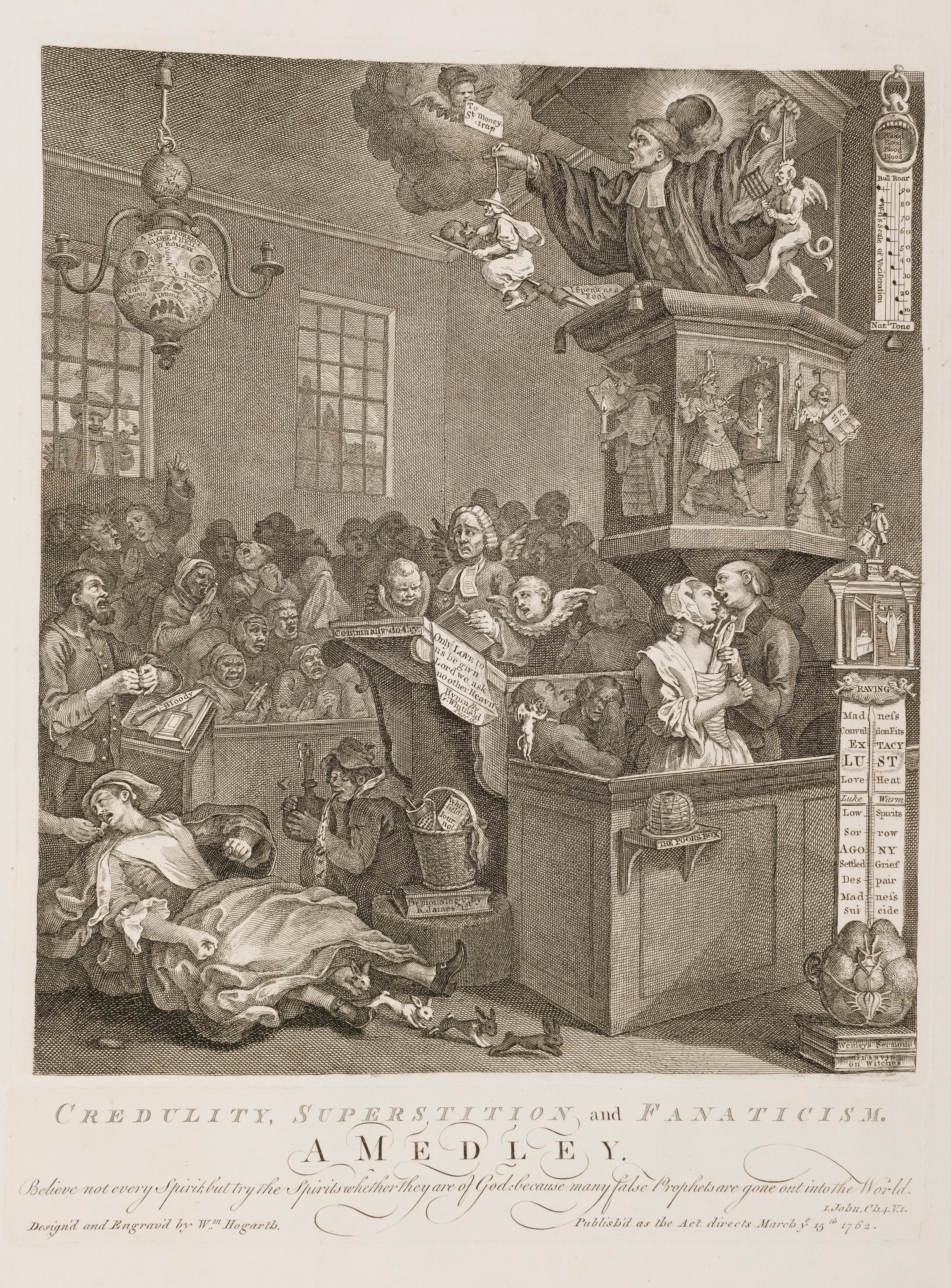 The handcuffed Felon is obliterated, and his place supplied by two figures, one weeping, the other asleep. The ragged Woman hugging a model is altered to the Boy of Bilson; and on the hassock where there was the howling Dog is a shoeblack's basket with "Whitefield's Journal" placed upon "King James's Demonology." The characters of the Cherubim are changed, and though the Duck's wings are left, the feet are lopped off. In the place of the corpulent and consequential Clerk, the Artist has inserted a meagre and moon-eyed Monster, with wings that either grow out of his shoulders, or belong to a foul Fiend, planted behind him, and acting as his prompter. Mother Douglas is beaten out of the copper, and in her room Hogarth has introduced Mrs. Tofts and her Rabbits, one of the popular impositions of his own day. The smelling-bottle, applied to recover Mrs. Douglas from fainting, is with Mrs. Tofts very properly changed to a dram-glass. The Jew is altered, and altered for the worse: the print of Abraham and Isaac, in the book before him, is obliterated, and a knife inscribed "bloody," and laid upon an altar, supplies its place. In the characters of the common people of the Congregation there are several variations; the models which some of them held in their arms are totally changed. The Pigeon in the Methodist's brain is discarded. In the place of the inscription in the top division of the Mental Thermometer he has inserted the Cock-lane Ghost; and instead of the Glory, which in the First Thought crowned the whole, we have the Tedworth Drummer; a tale which, had it not given the subject for Addison's Comedy, would have been long since forgotten. On the scale of Vociferation, and the Chandelier, the names of Romaine and Whitefield are only to be found in the present state of the Plate. In the scale of the Mental Thermometer there are numerous alterations. In "The Medley," the Artist has made an addition, and placed "Wesley's Sermons," and "Glanville on Witches," as supporters to the Methodist's brain. To do this, and introduce the Rabbits on the fore-ground, he has brought his work so near the bottom of his Plate as not to leave room for a Title, which, with the quotation from St. John, "Believe not every spirit," &c. will be found, by those who examine the Print in its present state, to be engraven on another piece of copper.