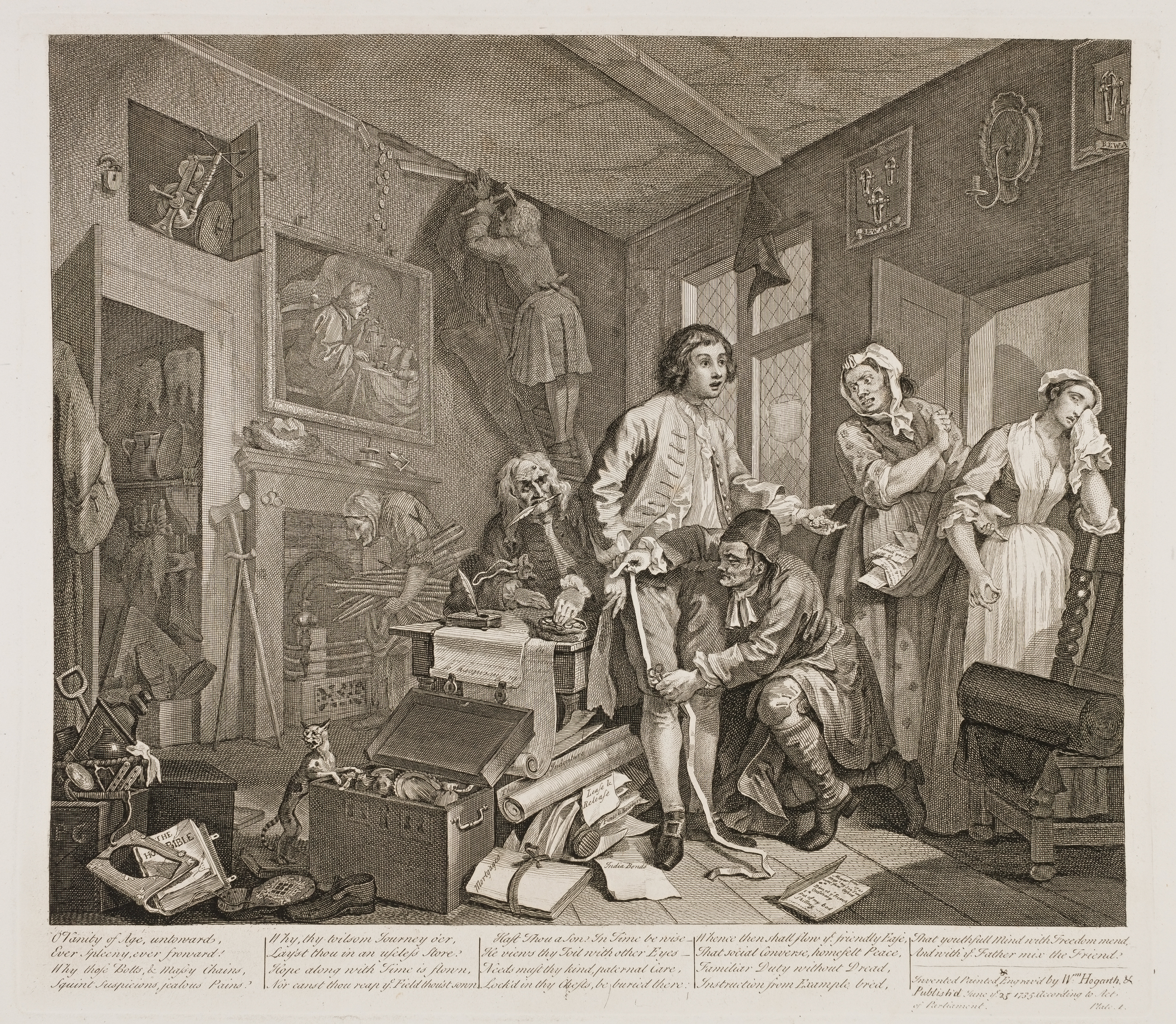 "The First Print of this capital work is an excellent representation of a young Heir taking possession of a Miser's effects. The passion of Avarice, which hoards every thing without distinction, what is and what is not valuable, is admirably described."