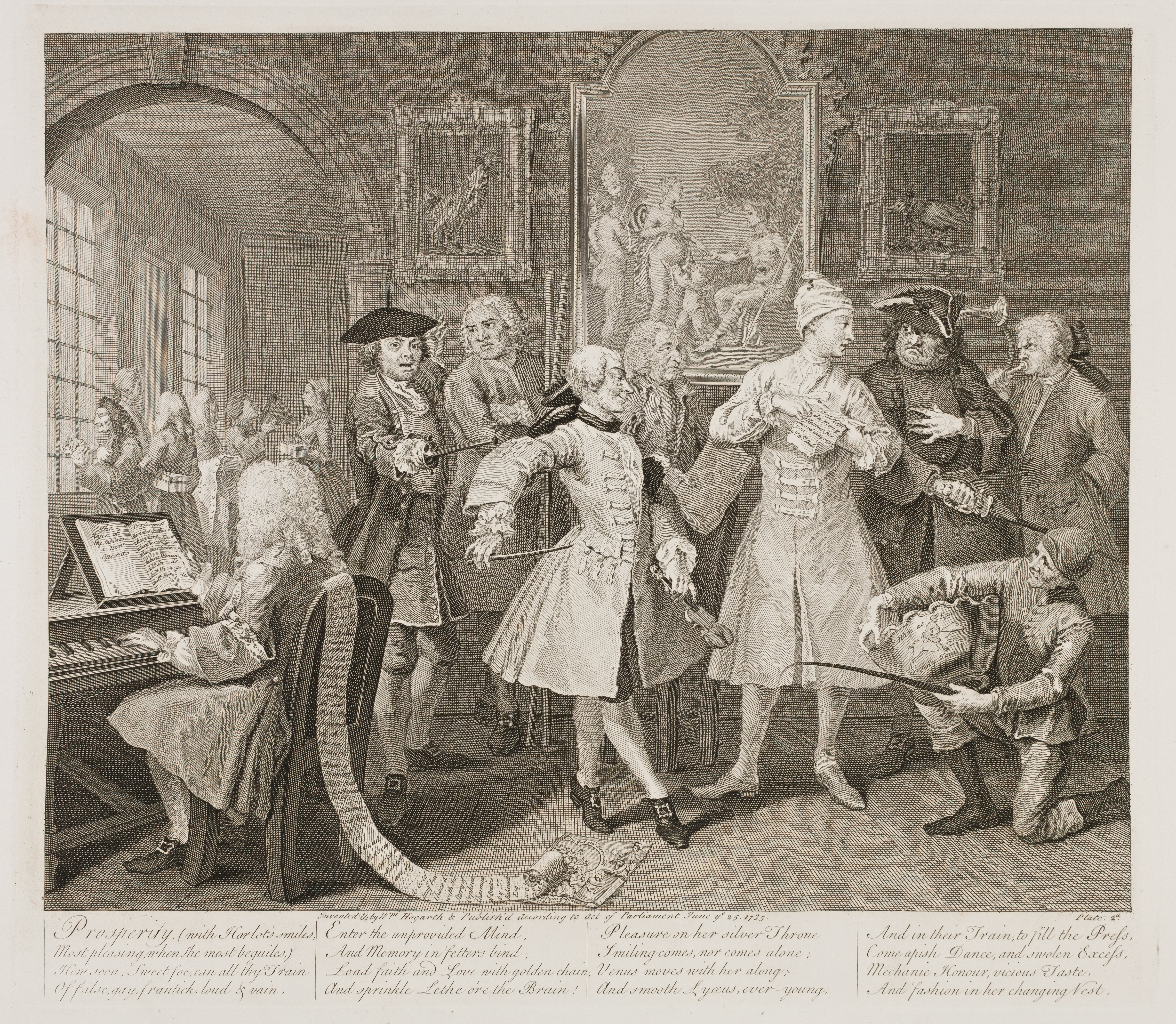 This set of Prints was engraved chiefly by Scotin: but several of the faces were touched upon by Hogarth. In the second Plate the countenance of the man with the quarter-staves was wholly engraved by himself. In some early proofs of the Print, there is not a single feature on this man's face; there is no writing either in the Musician's book, or on the label; nor is there the horse-race cup, the letter, or the poem that is at the end of the label, that being entirely blank. I mention these circumstances, to shew that our Artist would not intrust particular parts of his work to any hand but his own; or perhaps he had neither determined on the countenance or the inscription he meant to introduce till the Plate was far advanced. With unfinished Proofs, on any other account, this Explanatory Description has nothing to do. As the rudiments of Plates, they may afford instruction to young Engravers, or add a fancied value to the collections of Connoisseurs.