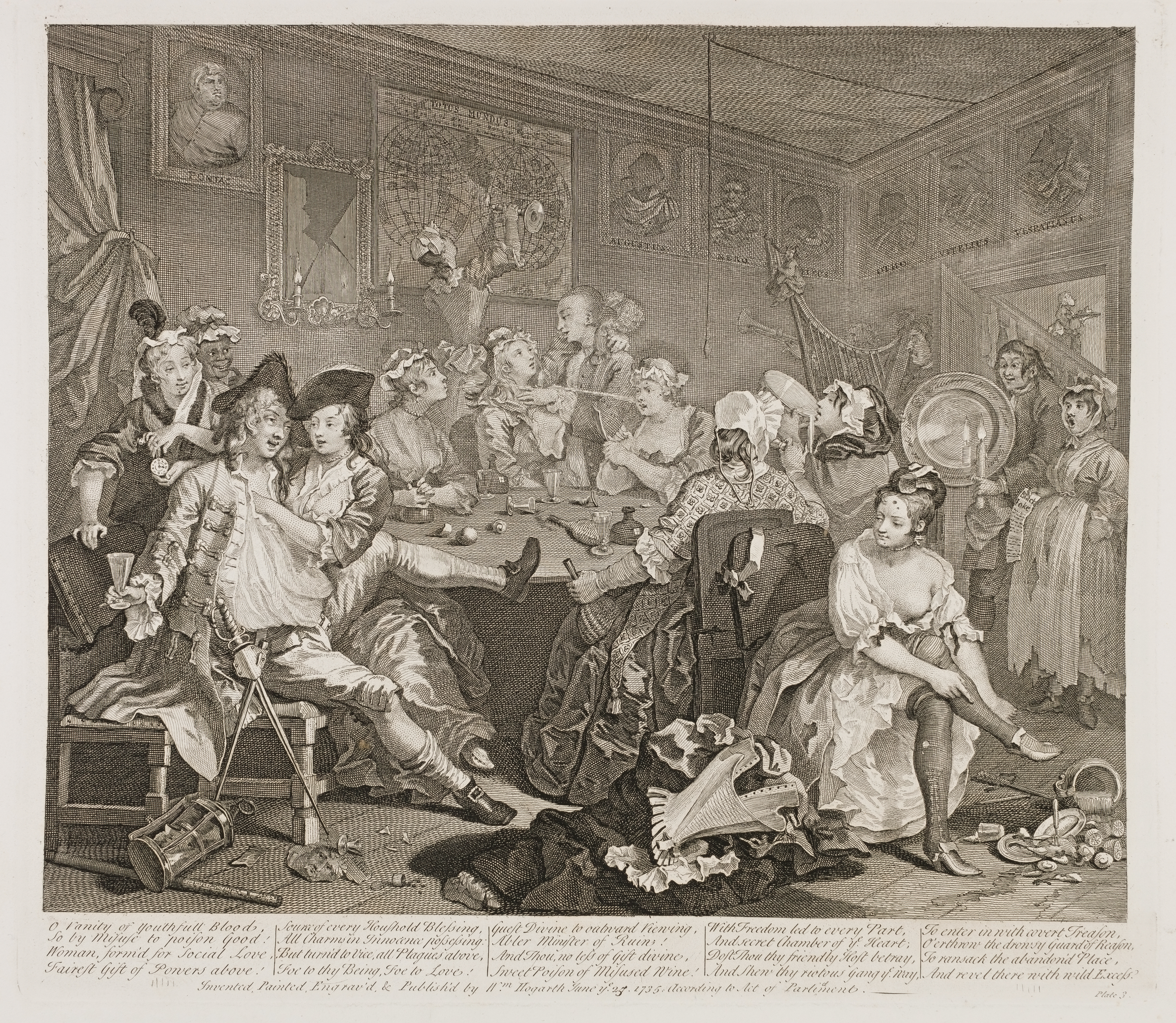 "The Third Plate carries us still deeper into the History. We meet our Hero engaged in one of his evening's amusements. This Print, on the whole, is no very extraordinary effort of genius. The design is good, and may be a very exact description of the humours of a brothel. The composition, too, is not amiss."