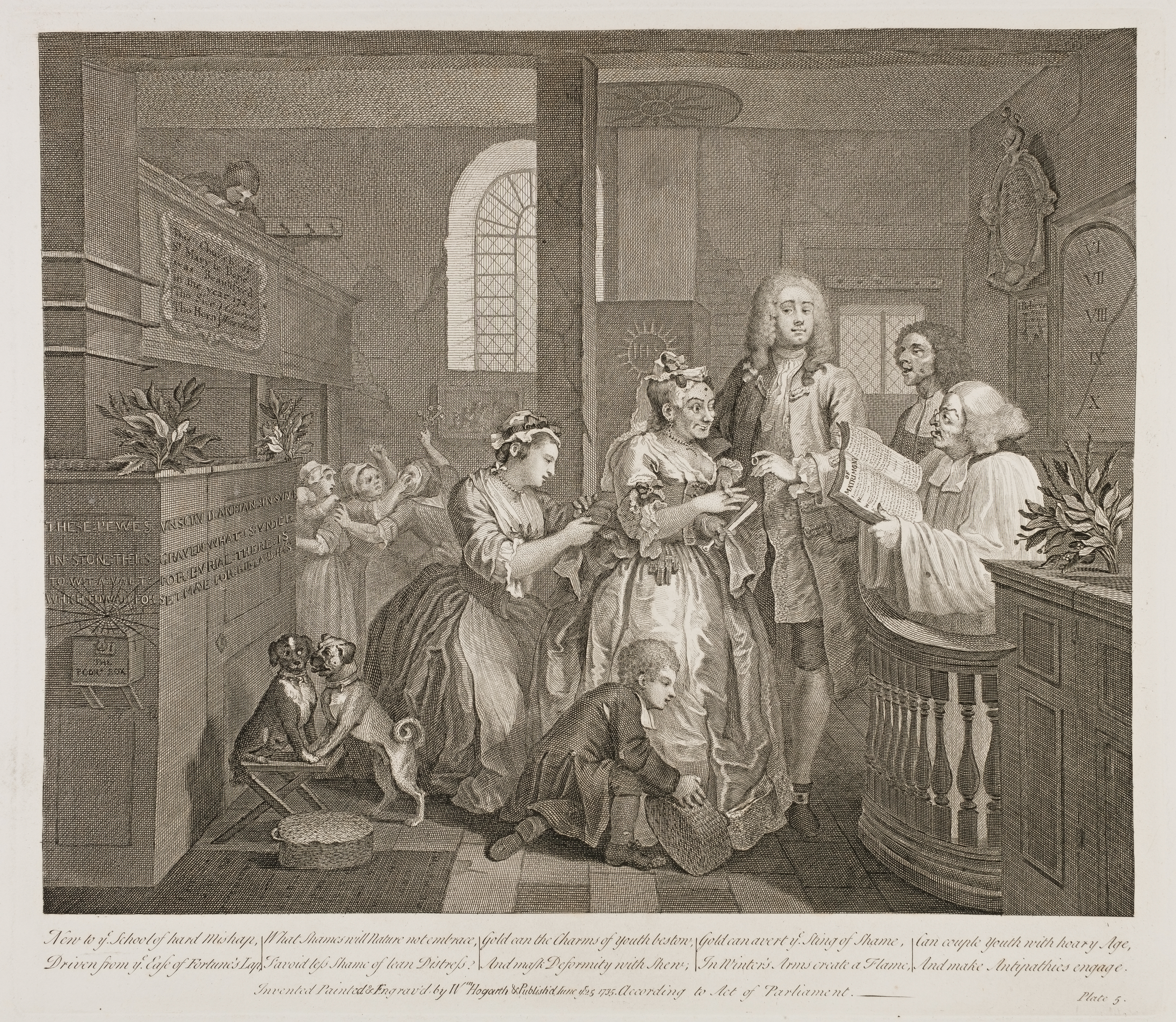 In this Plate Hogarth introduced his favourite dog Trump, paying his addresses to a one-eyed quadruped of his own species; a happy parody of the unnatural union going on in the Church. Of this dog his friend Roubiliac made a model as large as life.