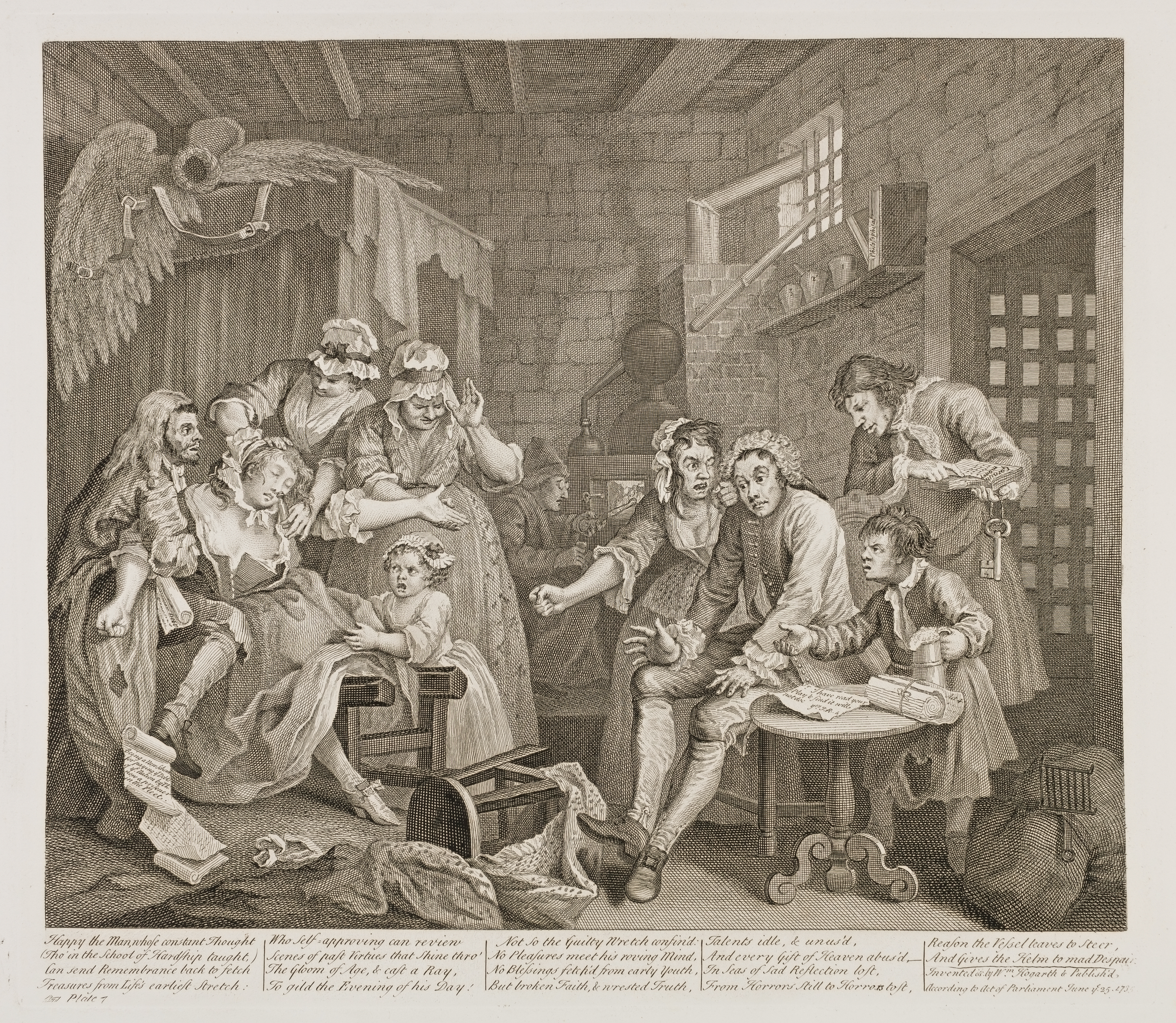 "The Seventh Plate, which gives us the view of a gaol, has very little in it. Many of the circumstances which may well be supposed to increase the misery of a confined Debtor are well contrived; but the fruitful genius of Hogarth, I should think, might have treated the subject in a more copious manner. The episode of the fainting woman might have given way to many circumstances more proper to the occasion. This is the same woman whom the Rake discards in the First Print; by whom he is rescued in the Fourth; who is present at his marriage; who follows him into gaol; and, lastly, to Bedlam. In the principal figure there is great expression; and the fainting scene is well described. A scheme to pay off the National Debt by a man who cannot pay his own, and the attempt of a silly Rake to retrieve his affairs by a work of genius, are admirable strokes of humour."