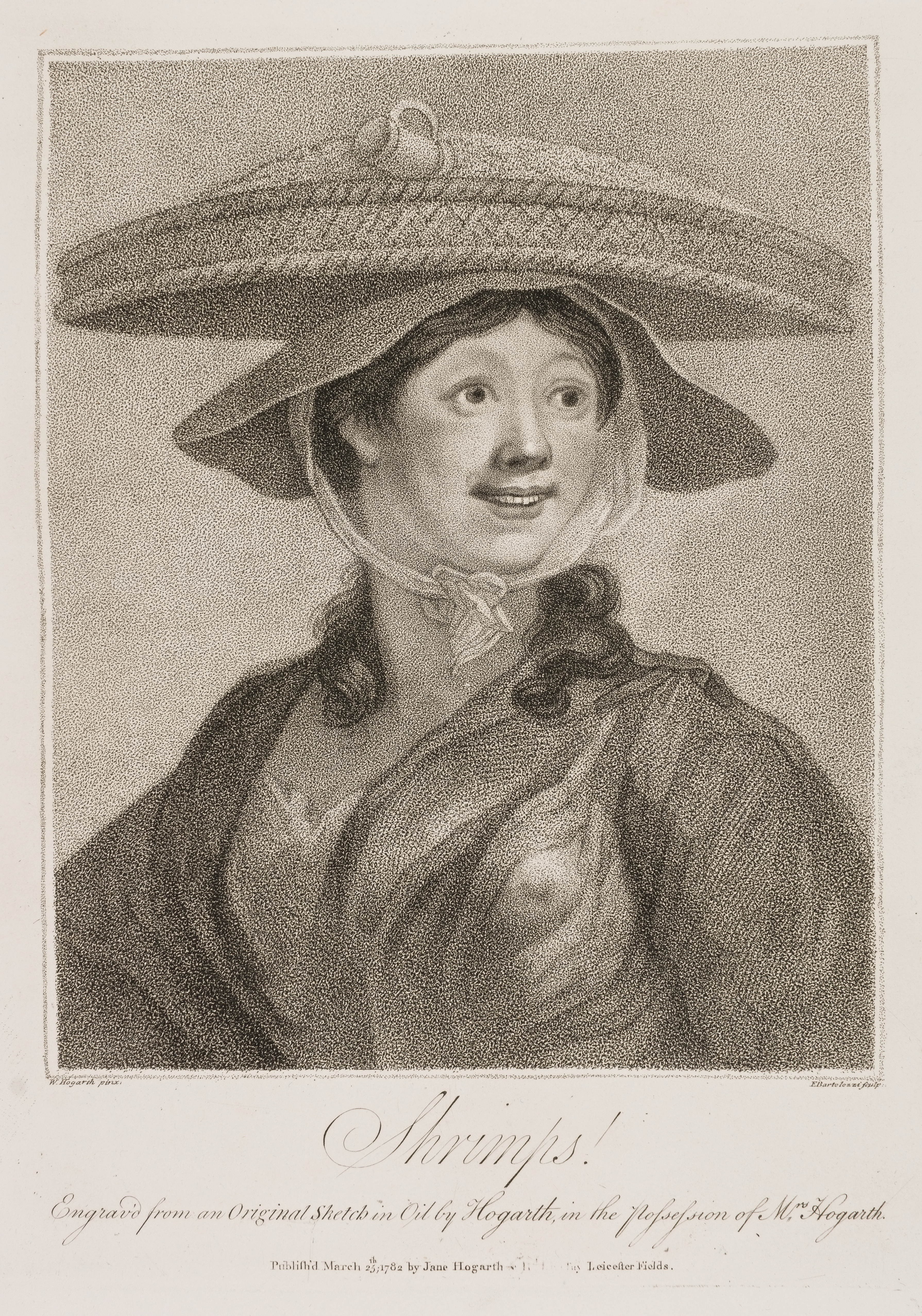 In this Portrait from the Life, first published in 1782 from the original sketch in oil, are united the talents of Hogarth and Bartolozzi; but the Plate, which is executed in the dotted manner so much in fashion, should have been etched, or engraved, like those excellent performances by Bartolozzi after the drawings of Guercino; as spirit, rather than delicacy, is the characteristic of our Artist's Shrimp-Girl.