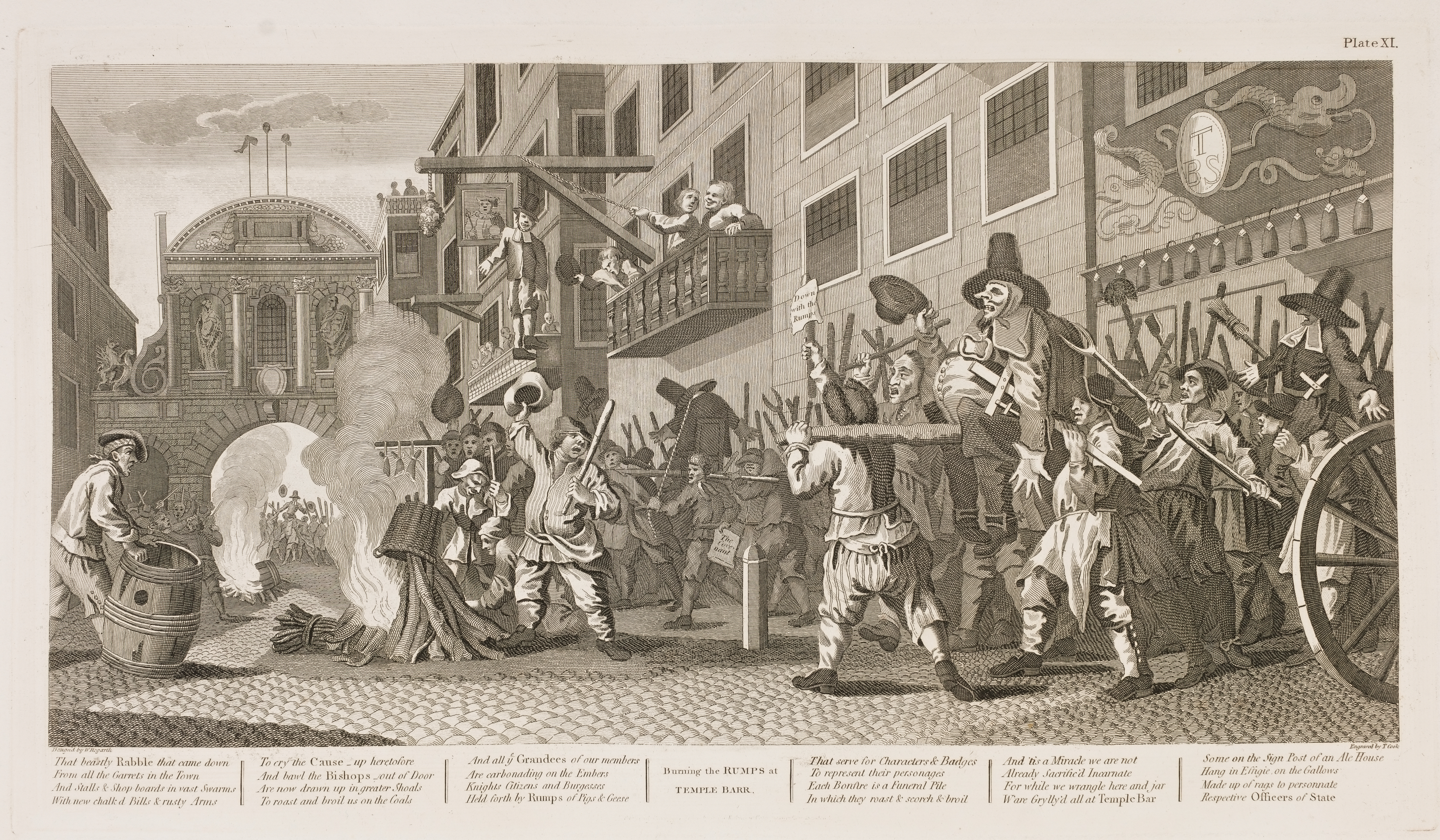In the earliest impressions of Plate XI. the words "Down with the Rumps" are not inserted on the scroll.