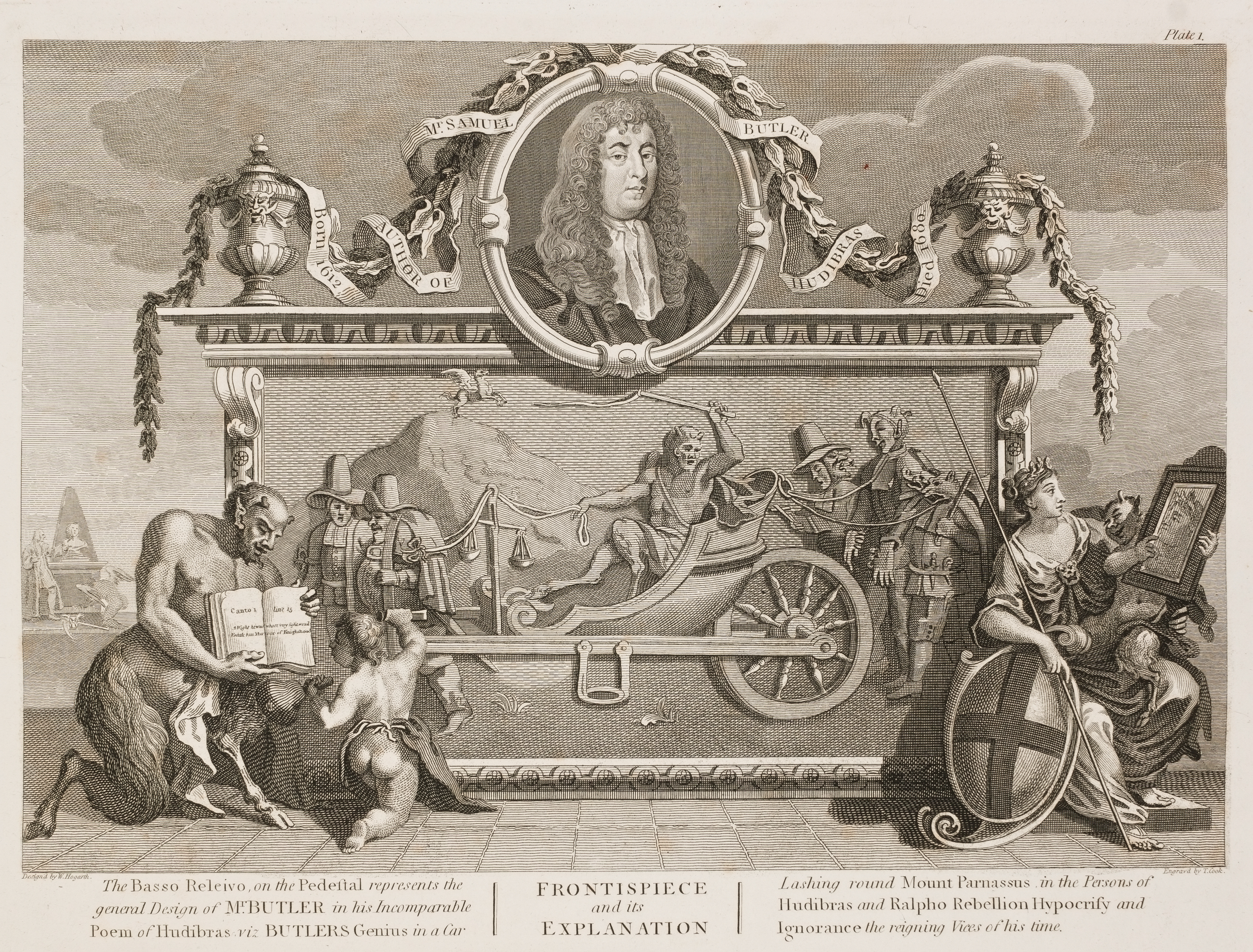 In the first of these Plates is a Portrait, inscribed "Mr. Samuel Butler, born 1612, Author of Hudibras, died 1680." The basso-relievo of the pedestal represents Butler's Genius in a car, lashing round Mount Parnassus, in the persons of Hudibras and Ralpho, Rebellion, Hypocrisy, and Ignorance, the reigning vices and follies of the time.