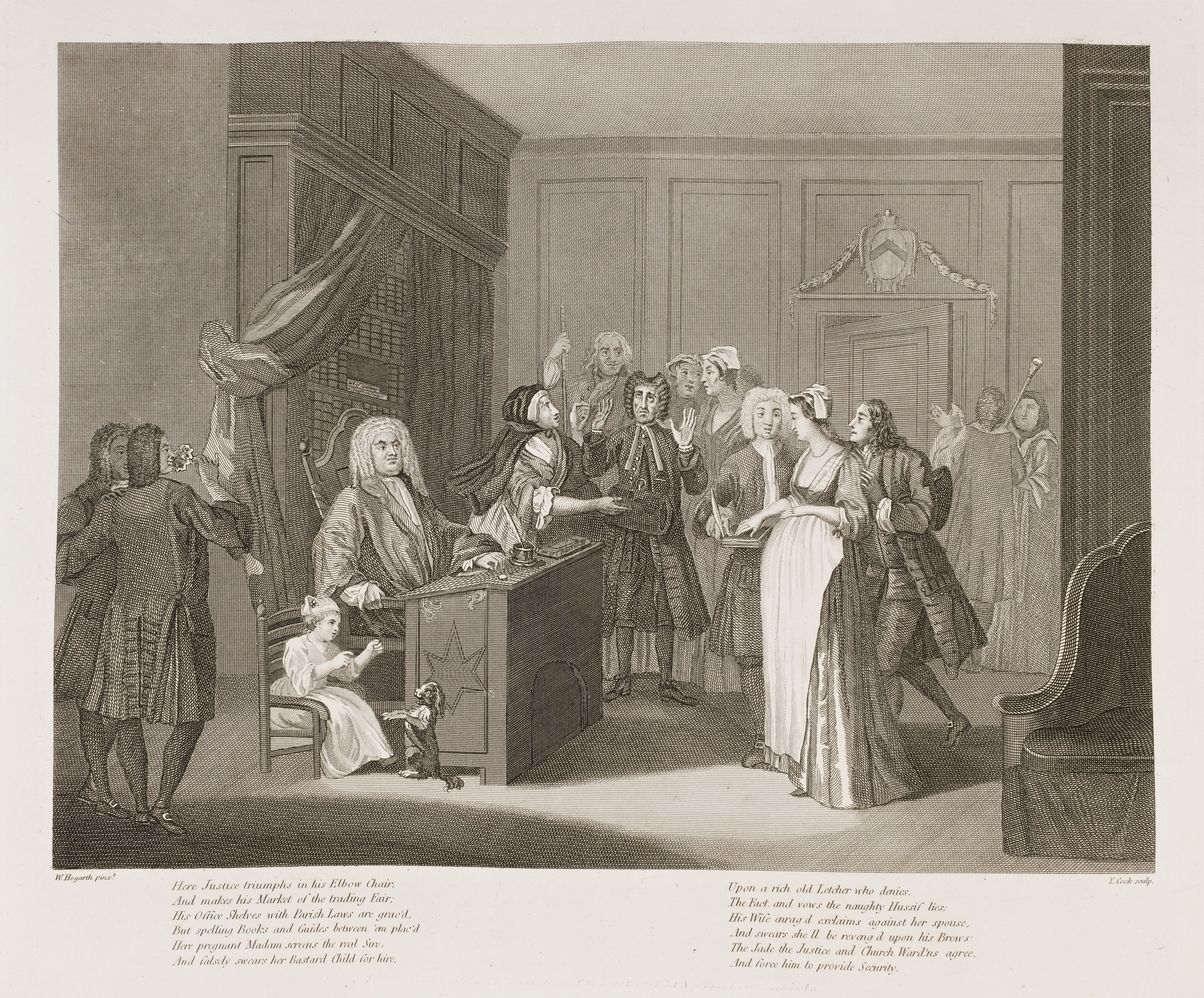 A large copy was published by John Bowles, under the title of "The Substitute Father, or Perjured W--------e swearing her Bastard Child upon a rich old Miser."
