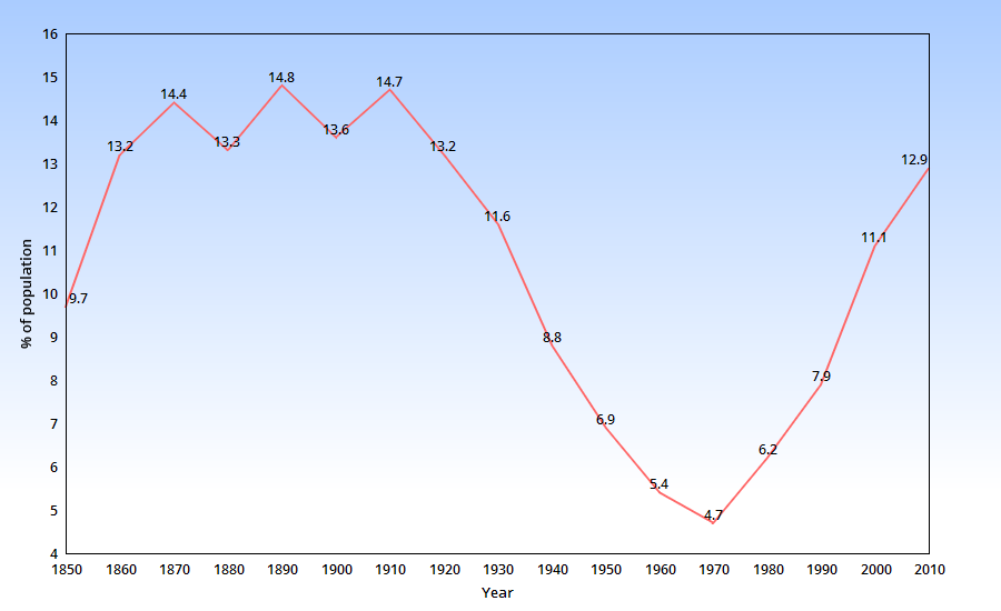 The percentage of the US population that is foreign-born, 1850-2010 (source: Census 2011).