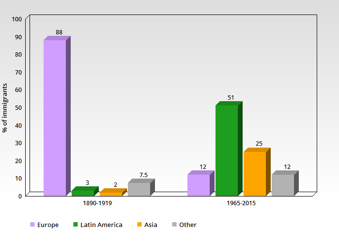 Regions of origin of immigrants arriving during the last two historic immigration waves (source: Pew 09-28-2015c).