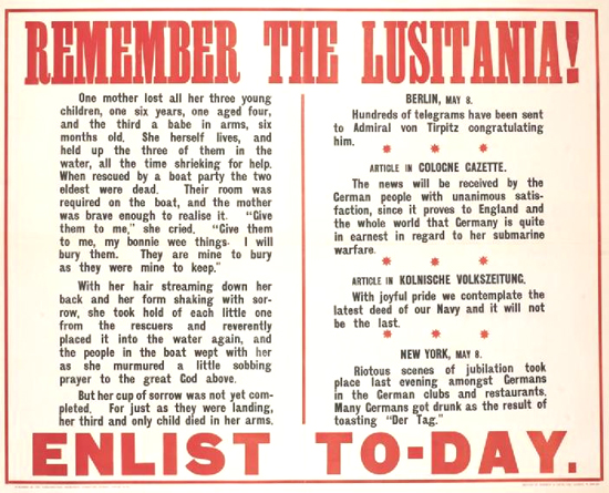 Captain Turner, Captain Schweiger, a passenger on the Lusitania, the artist who signed his poster W. E. T., a member of the Parliamentary Recruiting Committee who supervised the making of the propaganda poster, an Irish civilian who is shocked but doesn’t know if he wants to enlist, Winsor McCay, an American who is shocked but doesn’t know if the USA should enter the war, etc. It could be interesting to have the two captains argue over whether the sinking was justified or not.