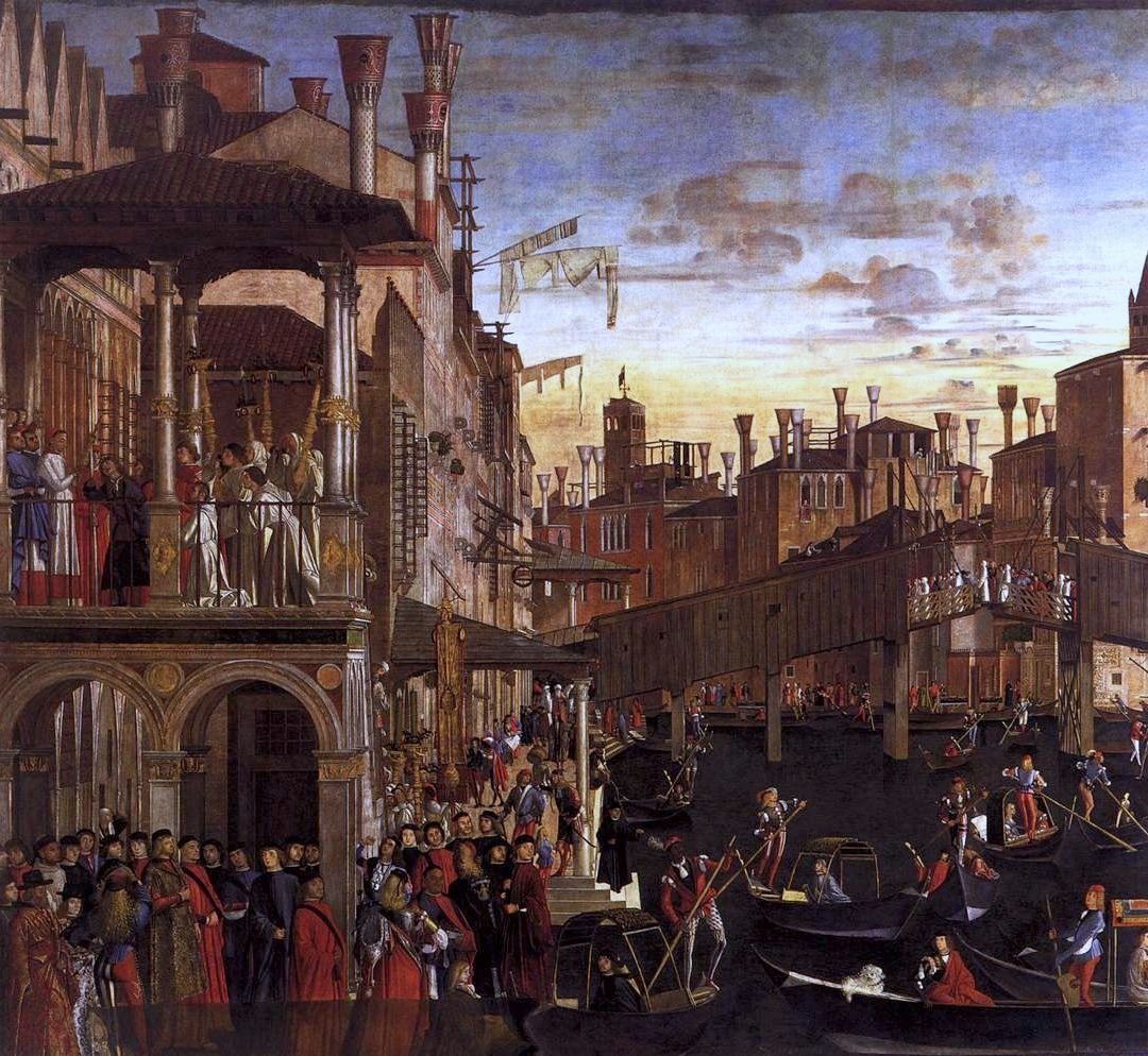 Les premières œuvres connues et datées de Vittore Carpaccio, les toiles représentant la vie de Sainte Ursule pour la Scuola di S. Orsola de Venise, exécutées entre 1494 et 1495, manifestent déjà une maîtrise parfaite de la perspective linéaire, aussi bien dans les scènes d’intérieur (Le Songe de Sainte Ursule) que dans les spectaculaires scènes d’extérieur (L’arrivée des ambassadeurs de Bretagne, Le Miracle de la relique de la Croix).